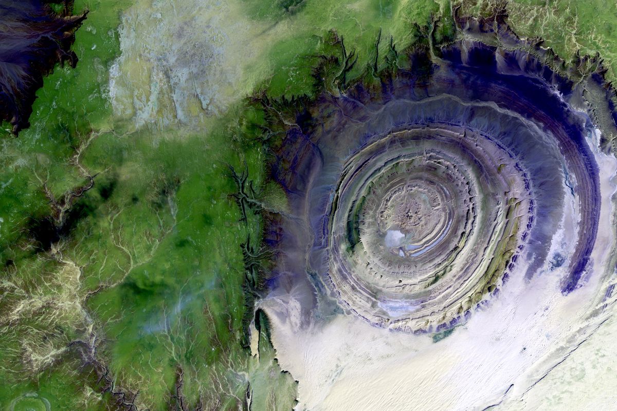 The Richat system – poetically known as the Eye of the Sahara – looks like the swirling scars of a massive impact on Earth.